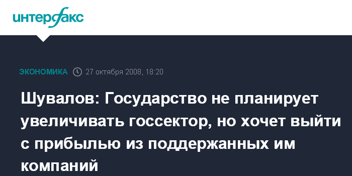 "У нас нет установки прибрать как можно больше к рукам и увеличить госсектор. У нас есть установка, чтобы мы извлекли прибыль (из операций, связанных с финансовой поддержкой компаний и банков - ИФ) и минимизировали последствия кризиса" - сказал первый вице-премьер.