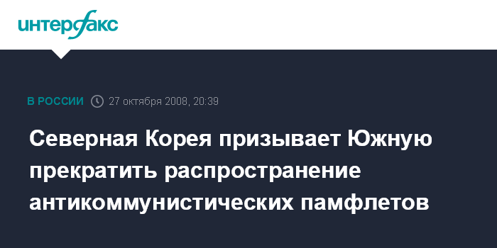 Москва. 27 октября. INTERFAX.RU - Власти КНДР настояли на том, чтобы Южная Корея приняла меры против распространения антикоммунистических пропагандистских памфлетов на территории Северной Кореи, сообщает агентство ЭФЭ.