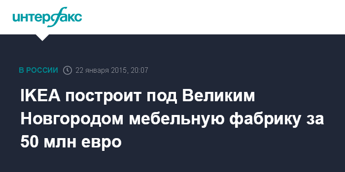 Москва. 22 января. INTERFAX.RU - Шведский ритейлер IKEA подтвердил планы строительства под Великим Новгородом мебельной фабрики стоимостью более 50 млн евро, говорится в сообщении пресс-службы правительства Новгородской области по итогам встречи с руководством IKEA в четверг.
