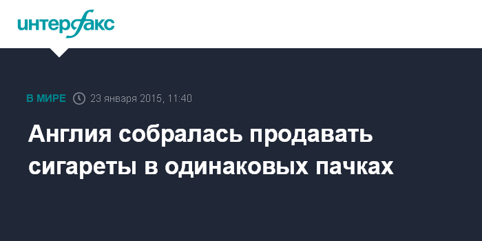 Москва. 23 января. INTERFAX.RU - Правительство Великобритании готовит новый законопроект, в соответствии с которым сигаретная продукция в Англии должна будет продаваться в унифицированных пачках, не имеющих фирменных знаков производителей, сообщает агентство Bloomberg.