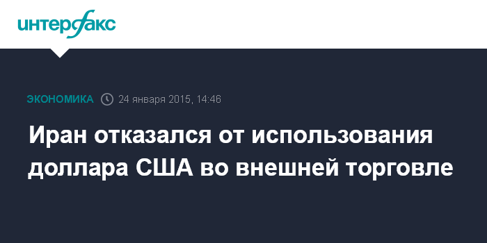 Москва. 24 января. INTERFAX.RU - Иран более не использует доллар США для проведения транзакций с зарубежными странами, сообщил в субботу иранскому агентству "Тасним" зампред Центрального банка Ирана Голямали Камьяб.