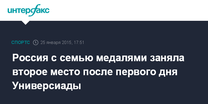 Москва. 25 января. INTERFAX.RU - Сборная России занимает второе место в общекомандном зачете Всемирной зимней Универсиады в Словакии после первого дня соревнований. В активе россиян - одна золотая, три серебряные и три бронзовые медали.