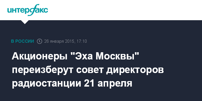 Москва. 26 января. INTERFAX.RU - Внеочередное собрание акционеров "Эха Москвы" состоится 21 апреля, сообщил в своем твиттере в понедельник главный редактор радиостанции Алексей Венедиктов.