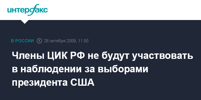 Москва. 28 октября. INTERFAX.RU - Члены Центризбиркома России не поедут в США для наблюдения за президентскими выборами, заявил глава ЦИК Владимир Чуров.
