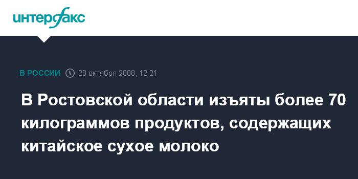 Москва. 28 октября. INTERFAX.RU - Управление Роспотребнадзора по Ростовской области продолжает контрольные проверки для выявления китайских продуктов, в составе которых может быть китайское сухое молоко с меламином.