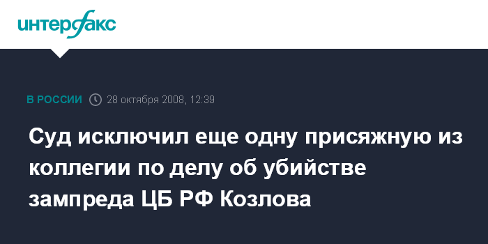Москва. 28 октября. INTERFAX.RU - Мосгорсуд принял решение удалить последнюю из запасных присяжных из коллегии, рассматривающей уголовное дело об убийстве первого зампредседателя ЦБ РФ Андрея Козлова.