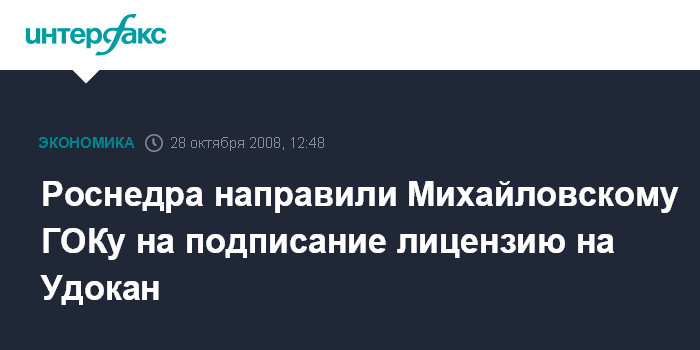 Москва. 28 октября. INTERFAX.RU - Роснедра направили Михайловскому ГОКу (входит в "Металлоинвест" Алишера Усманова", признанного победителем конкурса по разработке Удоканского месторождения меди в Читинской области) на подписание лицензионные документы, сказал журналистам глава ведомства Анатолий Ледовских.