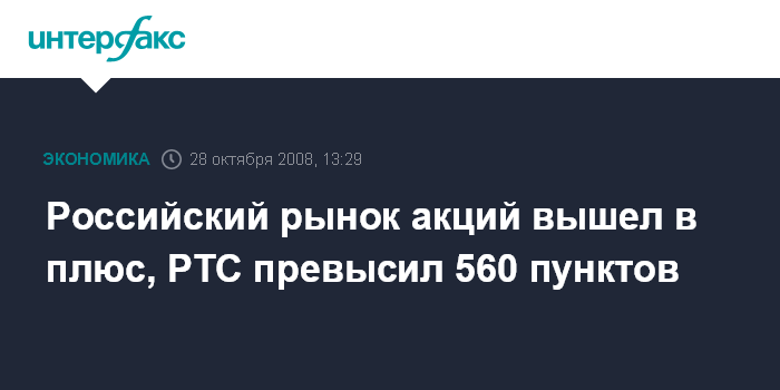 Москва. 28 октября. INTERFAX.RU - Российский рынок акций, демонстрировавший с утра разнонаправленные движения blue chips, днем вышел "в плюс" вслед за подъемом мировых фондовых площадок и нефти, индекс РТС превысил 560 пунктов.