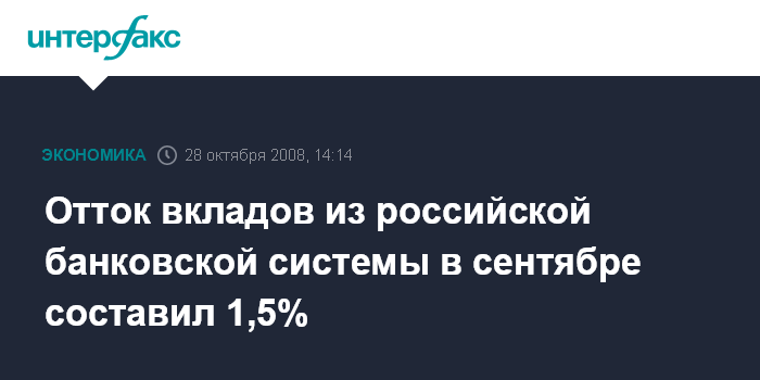 Москва. 28 октября. INTERFAX.RU - Отток вкладов физических лиц из банковской системы РФ в сентябре составил 1,5%, сообщил журналистам директор департамента банковского регулирования и надзора Центробанка Алексей Симановский.