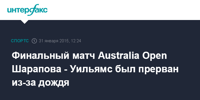 Москва. 31 января. INTERFAX.RU - Финал Открытого чемпионата Австралии по теннису между Марией Шараповой и Сереной Уильямс был остановлен из-за начавшегося ливня.