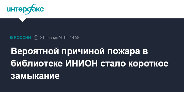 Москва. 31 января. INTERFAX.RU - Основная версия возгорания в библиотеке Института научной информации по общественным наукам на юго-западе Москвы - короткое замыкание электропроводки, однако будут проверяться и другие версии, сообщил в субботу "Интерфаксу" источник в правоохранительных органах.