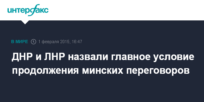 Москва. 1 февраля. INTERFAX.RU - Главным условием продолжения минских переговоров представители самопровозглашенных ДНР и ЛНР называют прекращение обстрелов мирных городов Донбасса со стороны украинских силовиков при помощи тяжелого вооружения.