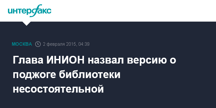 Москва. 2 февраля. INTERFAX.RU - Директор Института научной информации по общественным наукам (ИНИОН) РАН Юрий Пивоваров опроверг версию об умышленном поджоге библиотеки института, сообщила газета "Коммерсант" в понедельник.