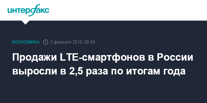 Москва. 2 февраля. INTERFAX.RU - Продажи LTE-смартфонов в России в 2014 году в штучном выражении выросли в 2,5 раза, до 4,2 млн, подсчитали аналитики розничной сети МТС. По их данным, совокупные продажи смартфонов увеличились на 40%, до 27,56 млн. Таким образом, доля LTE-смартфонов в общем объеме продаж "умных" телефонов в России составила в прошлом году 15%.