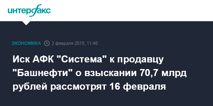 Иск АФК "Система" к продавцу "Башнефти" о взыскании 70,7 млрд рублей рассмотрят 16 февраля