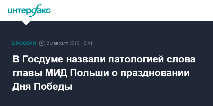 Москва. 2 февраля. INTERFAX.RU - В Госдуме РФ видят очередное проявление русофобии в заявлении главы МИД Польши Гжегожа Схетыны, который заявил, что не понимает, почему День Победы будут отмечать в Москве.