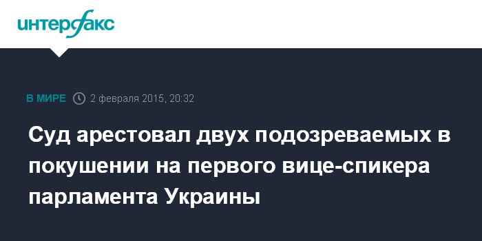 Москва. 2 февраля. INTERFAX.RU - Двое подозреваемых в покушении на жизнь первого заместителя председателя Верховной рады Украины Андрея Парубия взяты под стражу по решению суда, сообщает в понедельник пресс-служба прокуратуры Киева.