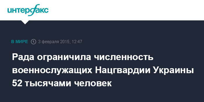 Согласно принятым изменениям, численность Национальной гвардии Украины будет ограничена 52 тыс. военнослужащими, тогда как общая штатная численность осталась неизменной (не более 60 тыс человек). "В случае необходимости численность Национальной гвардии Украины может быть увеличена соответствующим законом", - говорится в документе.