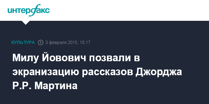 Москва. 3 февраля. INTERFAX.RU - Милу Йовович пригласили сыграть одну из главных ролей в экранизации серии коротких рассказов автора "Песни льда и огня" Джорджа Р.Р. Мартина, сообщает The Hollywood Reporter.