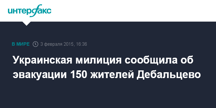 Москва. 3 февраля. INTERFAX.RU - Из Дебальцево, где не прекращаются обстрелы, во вторник были эвакуированы 150 человек, сообщил заместитель начальника ГУМВД Украины в Донецкой области Илья Кива.
