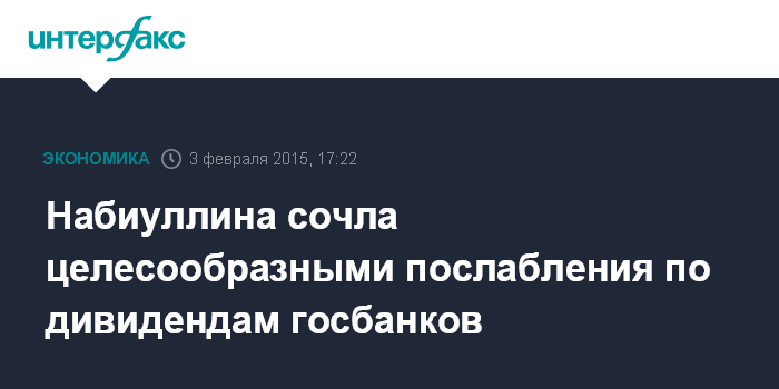 Москва. 3 февраля. INTERFAX.RU - Председатель Банка России Эльвира Набиуллина считает целесообразным снизить требования к размеру дивидендов, уплачиваемых государственными банками.