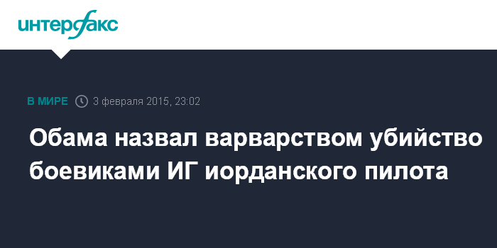 Москва. 3 февраля. INTERFAX.RU - Президент США Барак Обама резко осудил убийство боевиками "Исламского государства" пилота ВВС Иордании, сообщают во вторник американские СМИ.