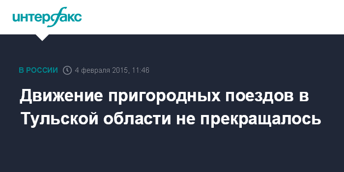 Москва. 4 февраля. INTERFAX.RU - В Тульской области движение электропоездов пригородного сообщения не прекращалось, сообщил "Интерфаксу" в среду начальник департамента по связям с общественностью ОАО "Центральная пригородная пассажирская компания" (ЦППК) Илья Черняев. Он уточнил, что в настоящее время продолжает действовать подписанное с правительством Тульской области соглашение о перевозке пассажиров в 2015 году.
