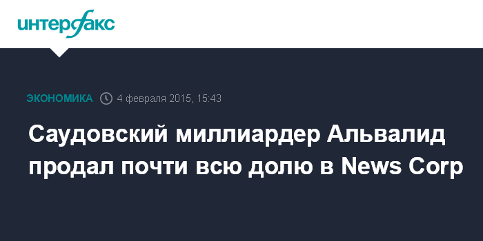 Москва. 4 февраля. INTERFAX.RU – Принадлежащая саудовскому миллиардеру Альвалиду бин Талалу инвестиционная фирма Kingdom Holding продала значительную часть доли в медиакорпорации Руперта Мердока News Corp., уменьшив ее с 6,6% до 1%, сообщает Bloomberg.