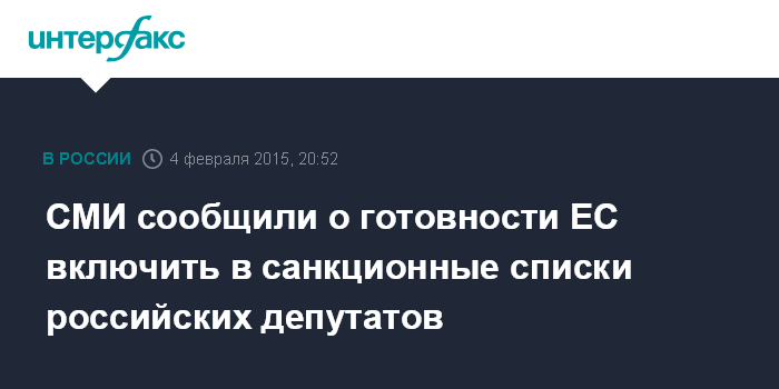 Москва. 4 февраля. INTERFAX.RU - Евросоюз, вероятно, собирается ввести дополнительные ограничительные меры в отношении высокопоставленных российских официальных лиц из-за ситуации на востоке Украины, сообщает в среду немецкая газета Frankfurter Allgemeine Zeitung.
