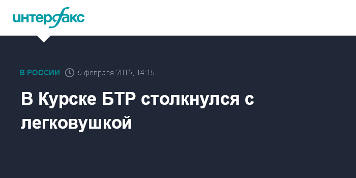 Москва. 5 февраля. INTERFAX.RU - В Курске в четверг на перекрестке улиц Красной армии и Добролюбова столкнулись БТР и "Хендай", сообщили "Интерфаксу" в управлении ГИБДД Курской области.