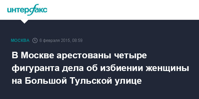 Москва. 6 февраля. INTERFAX.RU - Нагатинский суд Москвы в четверг арестовал до 26 марта четырех предполагаемых фигурантов дела о жестоком избиении женщины на юге столицы в конце января.