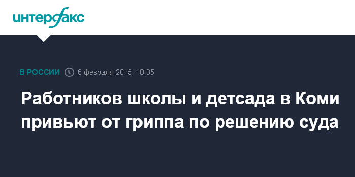 Москва. 6 февраля. INTERFAX.RU - Отказавшихся от вакцинации работников школы и детсада Прилузского района Коми привьют от гриппа по решению суда, сообщает пресс-служба региональной прокуратуры.