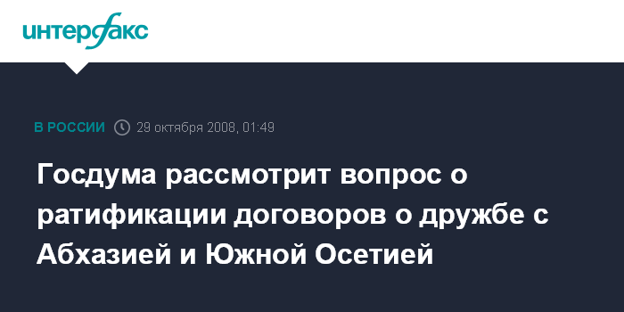 Москва. 29 октября. ИНТЕРФАКС - Госдума в среду рассмотрит вопрос о ратификации двух договоров о дружбе, сотрудничестве и взаимной помощи с Абхазией и Южной Осетией.