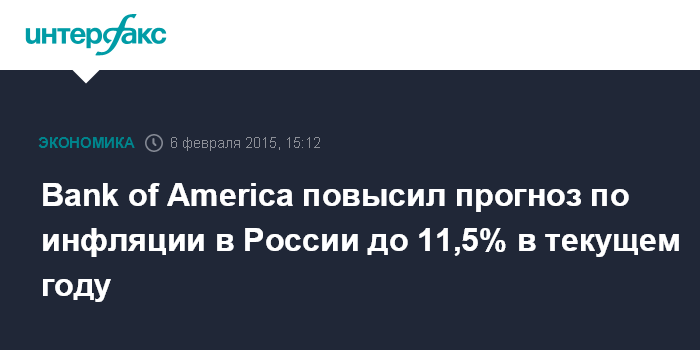 Москва. 6 февраля. INTERFAX.RU – Bank of America Merrill Lynch Global Research (BofA-ML) повысил прогноз по инфляции в России на конец 2015 года с 9,7% до 11,5%, а среднегодовой - с 13,2% до 15,2% в связи с более высокой, чем ожидалось, инфляцией в январе, сообщается в обзоре экономиста банка по РФ и СНГ Владимира Осаковского.