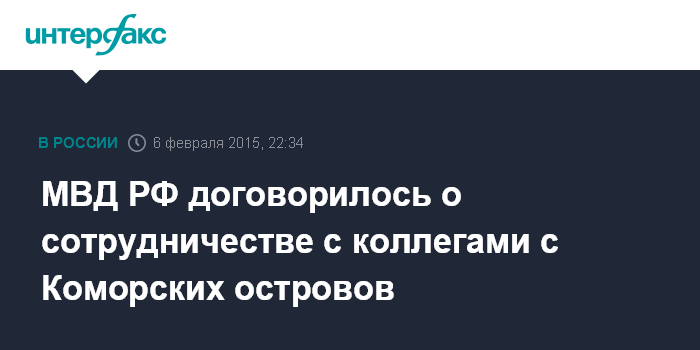Москва. 6 февраля. INTERFAX.RU - Соглашение о сотрудничестве подписано между МВД России и министерством внутренних дел, информации и децентрализации Коморских островов, сообщили "Интерфаксу" в пресс-центре МВД России.