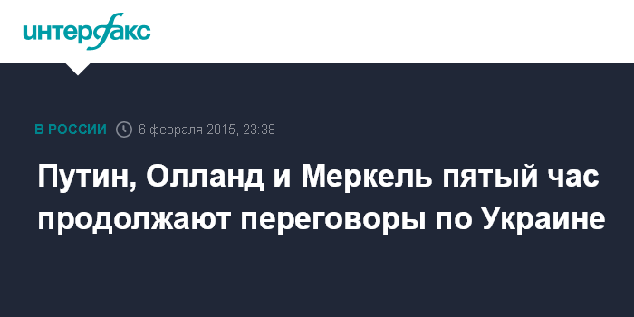 Москва. 6 февраля. INTERFAX.RU - Встреча президента РФ Владимира Путина с президентом Франции Франсуа Олландом и канцлером ФРГ Ангелой Меркель в Кремле продолжается уже почти пять часов.