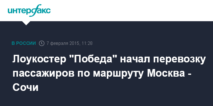 Москва. 7 февраля. INTERFAX.RU - ООО "Бюджетный перевозчик" (100%-ная "дочка ОАО "Аэрофлот - российские авиалинии") летает под брендом "Победа") с 6 февраля ввело ежедневный рейс по маршруту Москва - Сочи и обратно, сообщает пресс-служба "Базэл Аэро".