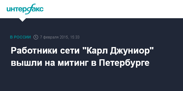 Москва. 7 февраля. INTERFAX.RU - Сотрудники сети ресторанов быстрого питания "Карл Джуниор" в субботу вышли на митинге на площадь Ленина в Петербурге, требуя выдать им зарплату за январь.