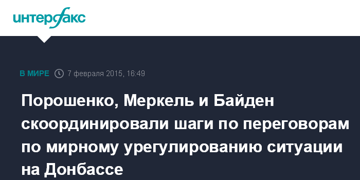 Москва. 7 февраля. INTERFAX.RU - Президент Украины Петр Порошенко, федеральный канцлер Германии Ангела Меркель и вице-президент США Джо Байден на трехсторонних переговорах в Мюнхене обсудили развитие переговоров по мирному урегулированию ситуации на Донбассе и отметили необходимость прекращения огня.