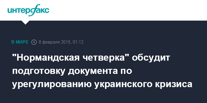 Москва. 8 февраля. INTERFAX.RU - Лидеры "нормандской четверки" - России, Франции, Германии, Украины - как ожидается, проведут в воскресенье телефонный разговор, в котором подведут предварительные итоги работы над совместным документом по урегулированию украинского кризиса.