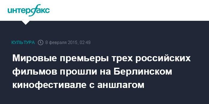 Москва. 8 февраля. INTERFAX.RU - Премьеры трех российских картин состоялись в рамках 65-го Берлинского кинофестиваля в пятницу, билеты были распроданы еще накануне, свободных мест в залах на премьерах фильмов не было.
