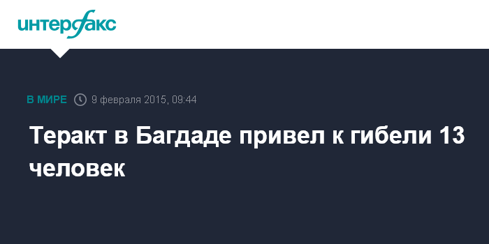 Москва. 9 февраля. INTERFAX.RU - Атака террориста-смертника привела к гибели 13 человек в столице Ирака, сообщает в понедельник телеканал "Аль-Арабийя".