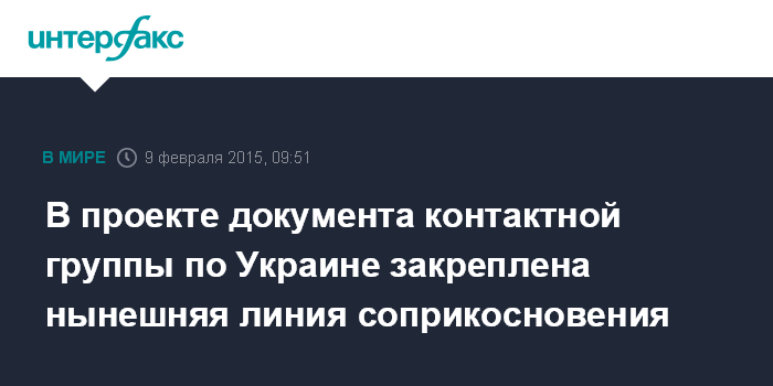 Москва. 9 февраля. INTERFAX.RU - Проект нового итогового документа по мирному урегулированию в Донбассе, который, как предполагается, обсудят участники контактной группы в Минске во вторник, базируется на нынешней линии соприкосновения сторон. Об этом "Интерфаксу" в понедельник сообщил источник в группе по организации минской встречи.