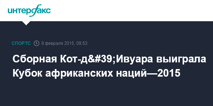 Москва. 9 февраля. INTERFAX.RU - Сборная Кот-д'Ивуара по футболу в финале Кубка африканских наций—2015 обыграла команду Ганы.