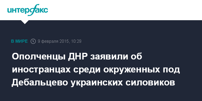 Москва. 9 февраля. INTERFAX.RU - В Минобороны ДНР утверждают, что украинские силы пытались вывезти из Дебальцево иностранцев. Возможно, речь идет об иностранных наемниках, сражавшихся на стороне украинских военных. Об этом сообщил журналистам представитель Минобороны самопровозглашенной ДНР Эдуард Басурин.