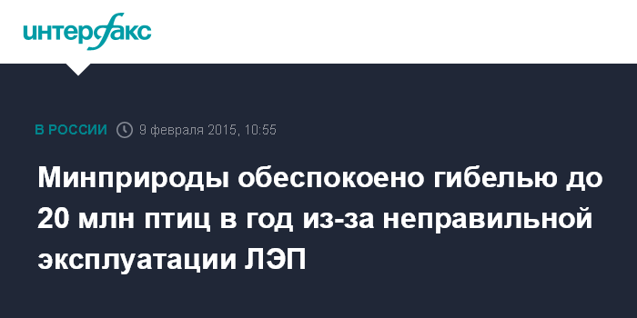 Москва. 9 февраля. INTERFAX.RU - Минприроды России обратилось в Россети за разъяснениями о нарушениях при эксплуатации воздушных линий электропередач (ЛЭП), на которых ежегодно погибает до 20 миллионов птиц.