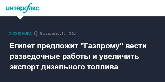 Москва. 9 февраля. INTERFAX.RU – Египет готов предложить российскому "Газпрому" инвестировать в разведку нефтегазовых месторождений на территории страны и увеличить экспорт дизельного топлива. Об этом пишет общеарабская газета "аль-Кудс" со ссылкой на анонимный источник в министерстве нефтяной промышленности Египта в связи с предстоящим визитом в страну президента России Владимира Путина.