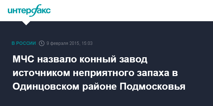 "В связи с обращением граждан о наличии неприятного запаха в воздухе в населенном пункте Аксиньино Одинцовского района Московской области в 11:06 на место выехали сотрудники МЧС. В результате было обнаружено место слива неустановленной жидкости на территории ОАО "Московский конный завод №1", - сообщили "Интерфаксу" в понедельник в пресс-службе ГУ МЧС по Московской области.