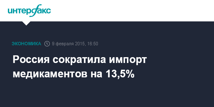 Москва. 9 февраля. INTERFAX.RU – Импорт медикаментов в Россию в 2014 году сократился на 13,5% по сравнению с 2013 годом - до $10,209 млрд, говорится в материалах Федеральной таможенной службы.