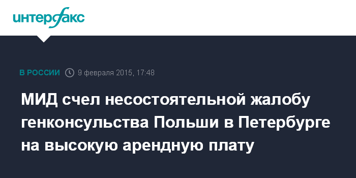Москва. 9 февраля. INTERFAX.RU - Заявления польской стороны о чрезмерно высоких расценках на аренду зданий для генерального консульства Польши в Петербурге не имеют под собой оснований, заявил представитель МИД в северной столице Владимир Запевалов.